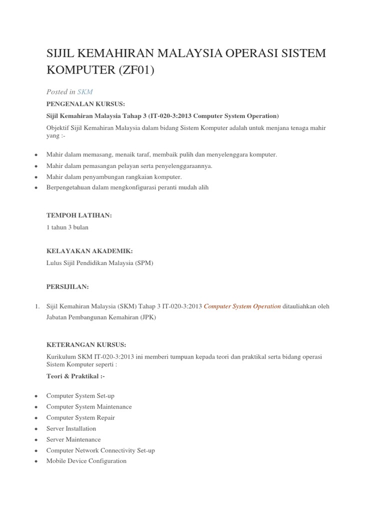 Sijil Kemahiran Malaysia SKM Tahap 2 juga masih. Ibu terangkan sedikit sebab zaman semakin berubah sistem pembelajaran pun semakin berubah. STRUKTUR KURSUS Struktur kursus adalah memenuhi standard dan keperluan yang ditetapkan oleh JTM.